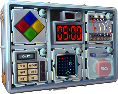 One person tries to defuse a bomb and gets helps by teammates who have the defusal manual but cannot see the bomb.