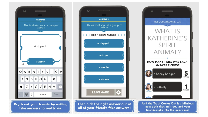 A party game where you are trying to fool others. You get points when you pick a correct answer or other people pick your fake answer.