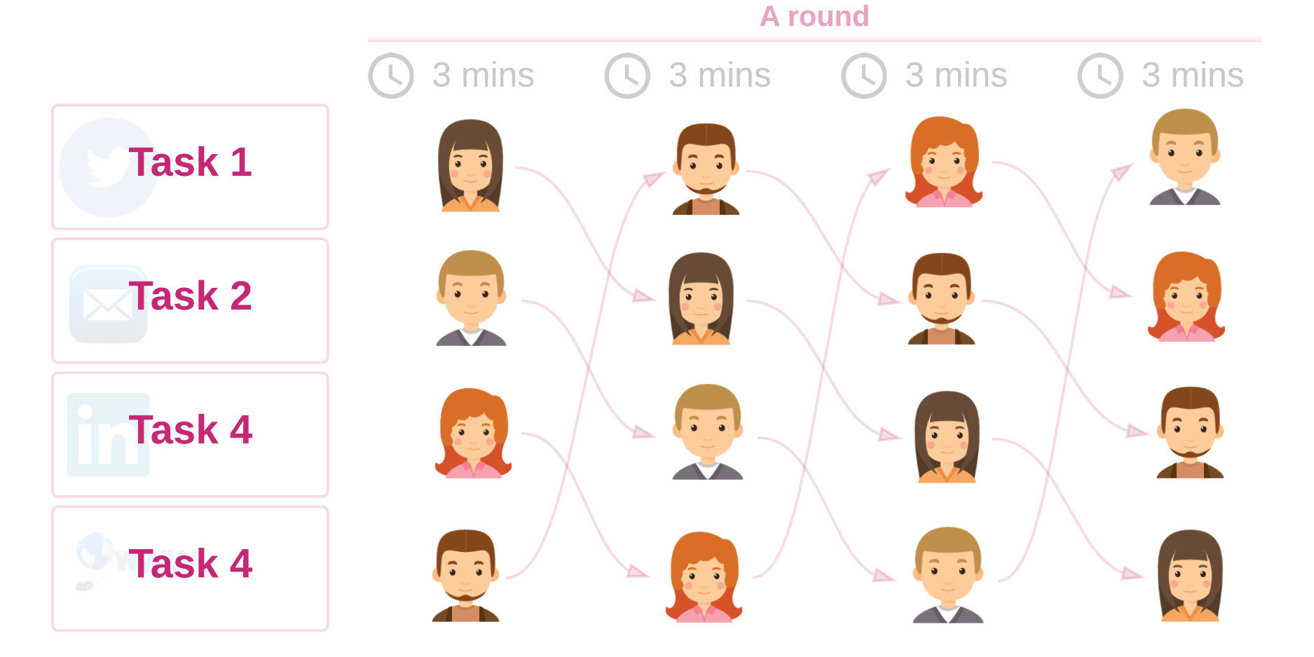 Step 3: Agree timebox for the tasks. Choose the time-keeper. Prefer a short time box, e.g. 2 or 3 minutes. Obviously 2-3 minutes is too little for an email and it's fine. It is critical that the time box is tight and it is completely fine if it is a bit too tight! If people have too much time, they won’t focus on what is most important and essential. Agree also how many rounds you’re going to have and who will take care of the time box.